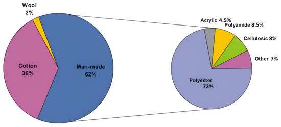 Global population growth and improvements in living standards have caused an increase in the consumption of textiles. This has resulted in the growth in textile production during the past few decades [1,2] and, consequently, in the increase in the amount of textile waste. Major components of textile products are natural (bio-organic) fibres (cotton—36% and wool—2%) and man-made fibres (synthetic and cellulosic—62%) [3] (Figure 1). The raw materials of synthetic fibres are based on petroleum, which is a non-renewable resource. Even the production of renewable natural polymers demands non-renewable resources, such as the supply of energy, chemicals for finishing, and synthetic dyestuffs, etc.