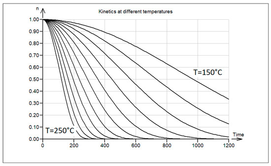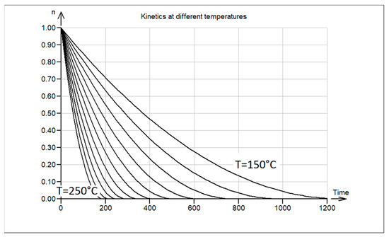 Theoretical reaction trajectories for the surface reaction at different temperatures, 150 °C through to 250 °C; time in arbitrary units; n is a relative amount of polymer.