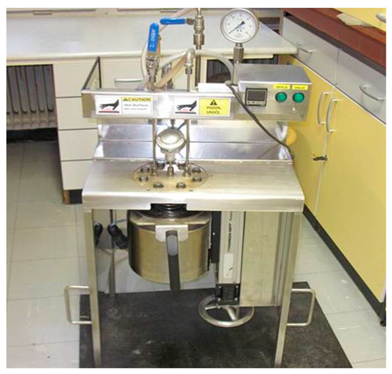 The model described by Equation (7) was used for the description of polyester yarns in terms of neutral hydrolysis kinetics. Polyester multifilament yarn (Julon Co), with a count of 78 dtex/36 filaments, was cut into portions with a length of 1–2 cm. The experiment was carried out in a special high-pressure reactor (see Figure 8) at 250 °C and 35–38 bars and with a PET/water ratio of 1:8. The hydrolysis products were dissolved in sodium hydroxide, with subsequent precipitation in hydrochloric acid, and analyzed using a Perkin Elmer FT-IR Spectrum GX spectrometer.