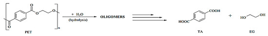 The hydrolysis of PET involves the chemical scission of an ester linkage by a water molecule, i.e., the mechanism of ester bonds is cleaved through the attack of nucleophilic agents is shown in Figure 9.