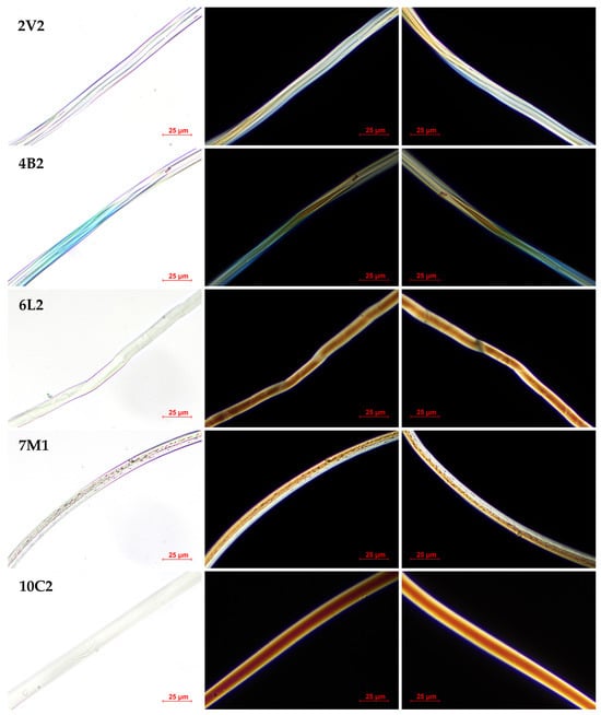For the lyocell (samples 5L1 and 6L2) and cupro fibers (samples 9C1 and 10C2), a smooth surface was observed, and in the cross-section, these fibers were round or nearly round (slightly oval). Both subtypes exhibited the same behavior under crossed polars when the fiber was oriented at 45° and 315°. The observed colors for colorless samples were mainly yellow and brown. The intensity of these colors was higher for the examined cupro fibers, and the colors themselves also seemed to be much more regular along their entire length. On the surfaces of the lyocell and cupro fibers, a fibrillation process was observed; this was a longitudinal splitting of the fiber into a bundle of microfibers of smaller diameter [3].