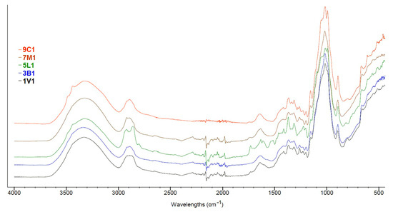 No significant differences were found between the spectra obtained from different parts of the same samples. Therefore, the spectra of each examined regenerated cellulose fiber (samples 1V1-10C2) were compared with one another, and selected examples are presented in Figure 3.