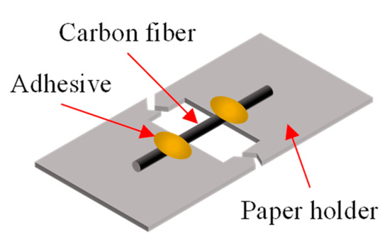 As reported in the literature, the tensile test specimen was prepared by affixing a single carbon fiber to a paper holder with an instant cyanoacrylate adhesive [3,4,5]. The specimen was then placed on the testing machine and the holder was cut into two pieces before testing. The gage length (L) was 5 mm, and the crosshead speed was 1.0 μm/s. Five replicate specimens were tested for all the carbon fibers. All tests were conducted in a laboratory environment at room temperature (23 °C ± 3 °C) with a relative humidity of 50% ± 5%.