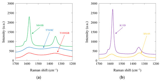 Raman spectra of PAN-based and pitch-based single carbon fibers: (a) T1000GB, T700SC, and M60JB PAN-based carbon fibers; (b) K13D and XN-05 pitch-based carbon fibers.