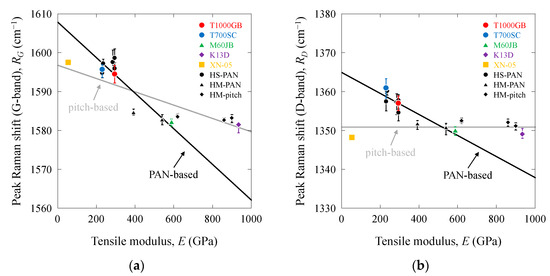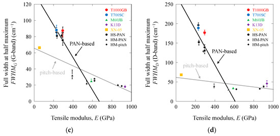 Figure 3a–d show the Raman scattering parameters (RG, RD, FWHMG, and FWHMD values) as a function of the tensile moduli (E) of the high-strength PAN-based, high-modulus PAN-based, high-modulus pitch-based, and high-ductility pitch-based carbon fibers (the tensile strength, σf, of PAN-based and pitch-based carbon fibers affected the gage length L. According to Table 1 and Table S1 in the Supporting Information, no significant relationship was observed between the Raman parameters and tensile strength). The RG, RD, FWHMG, and FWHMD values were notably high for the high-strength PAN-based carbon fibers. Conversely, these values were low for the high-modulus PAN-based and pitch-based carbon fibers. The RG and FWHMG values were high for the high-ductility XN-05 pitch-based carbon fibers, whereas the RD and FWHMD values were low. In addition, a clear distinction was observed between PAN-based and pitch-based carbon fibers. Considering the differences in the tensile modulus, the Raman scattering parameters (RG, RD, FWHMG, and FWHMD values) exhibited high sensitivities for PAN-based carbon fibers, whereas they exhibited low sensitivities for pitch-based carbon fibers. The least-square fitting lines for PAN-based and pitch-based carbon fibers are also depicted in Figure 3. The RG, RD, FWHMG, and FWHMD values of the PAN-based and pitch-based carbon fibers increased with an increase in E, whereas the RD value of the pitch-based carbon fibers remained nearly constant at 1350.9 cm−1. Linear relationships were observed between the RG, RD, FWHMG, and FWHMD values and E. The slopes of the PAN-based carbon fibers were higher than those of the pitch-based carbon fibers. These correlations were verified by evaluating the PAN-based and pitch-based carbon fibers separately. The lines for the PAN-based and pitch-based carbon fibers intersected at 400–600 GPa, suggesting a structural similarity between the PAN-based and pitch-based carbon fibers at approximately 400–600 GPa.