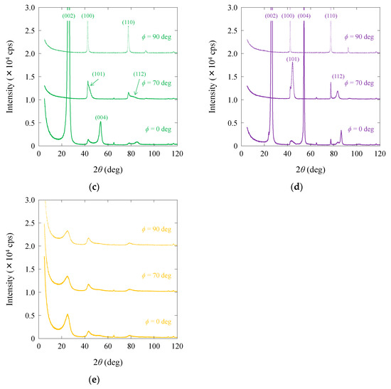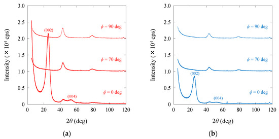 Structural differences between the carbon fibers were analyzed using an X-ray diffractometer (Rigaku RINT TTR III, Rigaku Corp., Tokyo, Japan; Cu Kα, 50 kV, 300 mA). The experiments were conducted with fiber bundles mounted on holders. To obtain radial scans at three distinct angles (ϕ = 0°, 70°, and 90°), scans were taken at 0° and 90° scans to correspond to equatorial and meridional views, respectively. A 70° scan was selected to detect the presence of three-dimensional reflections (112) and (101). Detailed information on the measurement technique can be found in previous studies [6,31,32].