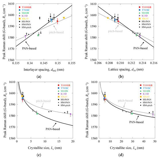 Peak Raman shift (G-band) as a function of structural parameters of PAN-based and pitch-based carbon fibers: (a) RG vs. d002; (b) RG vs. d10; (c) RG vs. Lc; (d) RG vs. La.