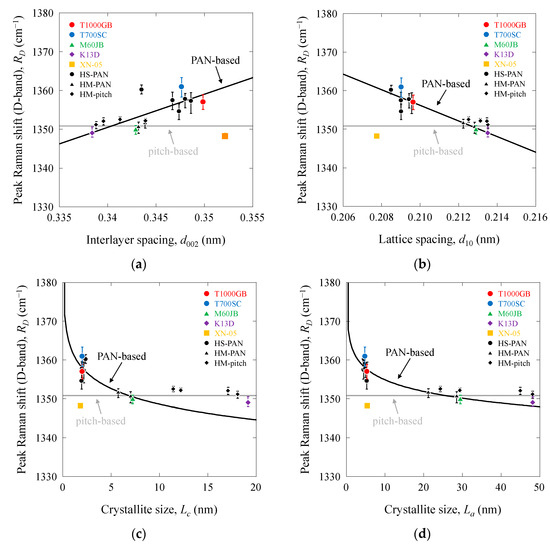 Peak Raman shift (D-band) as a function of structural parameters of PAN-based and pitch-based carbon fibers: (a) RD vs. d002; (b) RD vs. d10; (c) RD vs. Lc; (d) RD vs. La.