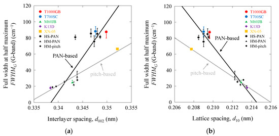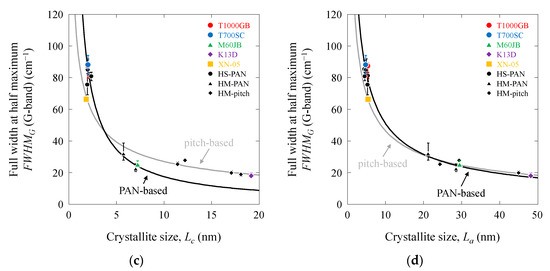 Full width at half maximum of G as a function of structural parameters of PAN-based and pitch-based carbon fibers: (a) FWHMG vs. d002; (b) FWHMG vs. d10; (c) FWHMG vs. Lc; (d) FWHMG vs. La.