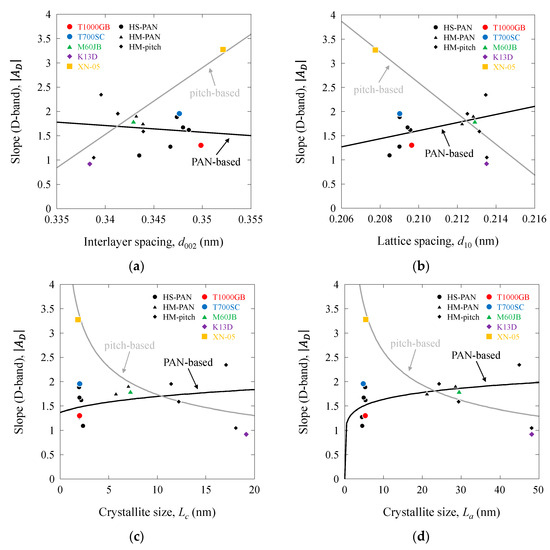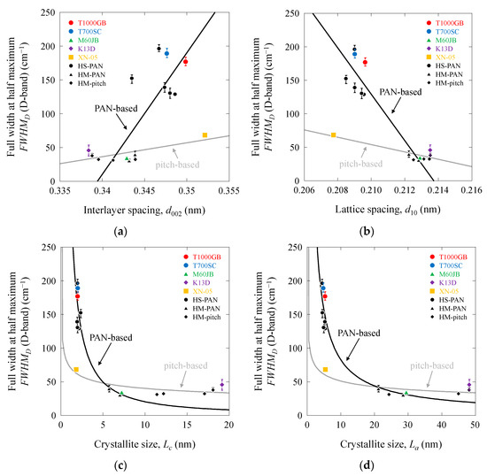 Full width at half maximum of D as a function of structural parameters of PAN-based and pitch-based carbon fibers: (a) FWHMD vs. d002; (b) FWHMD vs. d10; (c) FWHMD vs. Lc; (d) FWHMD vs. La.