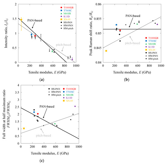 Raman scattering ratio as a function of tensile modulus of PAN-based and pitch-based carbon fibers: (a) ID/IG vs. E; (b) RD/RG vs. E; (c) FWHMD/FWHMG vs. E.