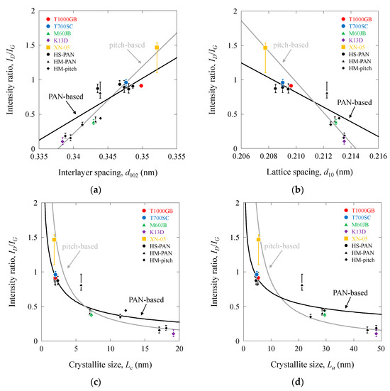 Raman intensity ratio as a function of structural parameters of PAN-based and pitch-based carbon fibers: (a) ID/IG vs. d002; (b) ID/IG vs. d10; (c) ID/IG vs. Lc; (d) ID/IG vs. La.