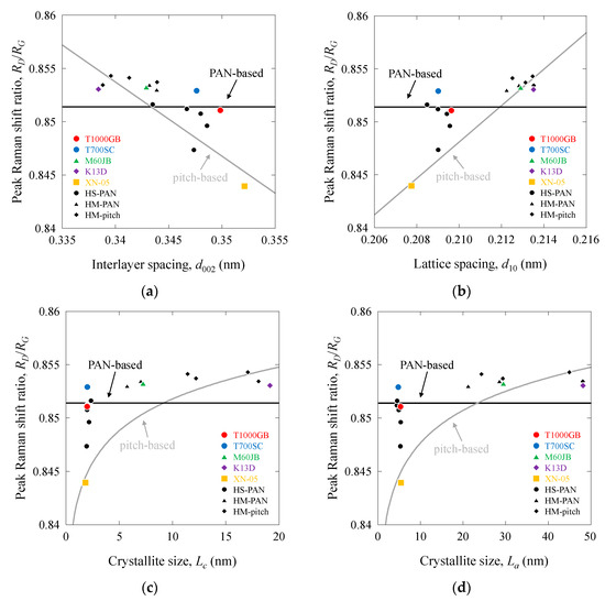 Peak Raman shift ratio as a function of structural parameters of PAN-based and pitch-based carbon fibers: (a) RD/RG vs. d002; (b) RD/RG vs. d10; (c) RD/RG vs. Lc; (d) RD/RG vs. La.