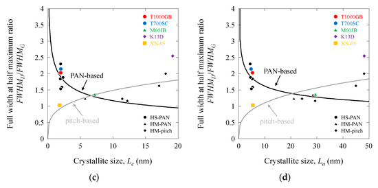 Full width at half maximum ratio as a function of structural parameters of PAN-based and pitch-based carbon fibers: (a) FWHMD/FWHMG vs. d002; (b) FWHMD/FWHMG vs. d10; (c) FWHMD/FWHMG vs. Lc; (d) FWHMD/FWHMG vs. La.