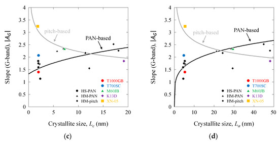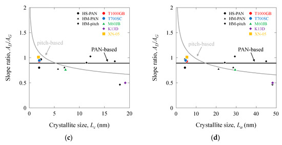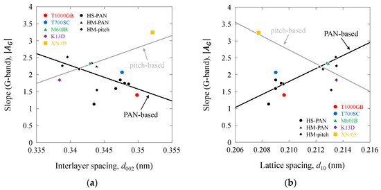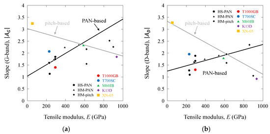 Figure 15 and Figure 16 show the |AG| and |AD| values as functions of d002, d10, Lc, and La. The |AG| and |AD| values of the PAN-based carbon fibers decreased with increasing d002, d10, Lc, and La, whereas those of the pitch-based carbon fibers increased with these structural parameters. Linear relationships were observed between |AG| and |AD| and d002 and d10. Moreover, linear relationships were observed between |AG| and |AD| and Lc, La on the log–log scale. Consequently, the |AG| and |AD| values (also BG and BD values) were associated with the structural parameters. The lines representing PAN-based and pitch-based carbon fibers intersected at approximately 0.342 (d002), 0.212 (d10), 7.9 (Lc), and 18 (La). These values correspond to those of the 400–600 GPa-class PAN-based and pitch-based carbon fibers.
