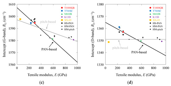 Figure 14a–d show the |AG|, |AD|, BG, and BD values and their relationship with the tensile modulus (E). These values were distinguished for the high-strength PAN-based, high-modulus PAN-based, high-modulus pitch-based, and high-ductility pitch-based carbon fibers. The |AG| and |AD| values were high for the high-ductility XN-05 pitch-based carbon fibers and low for the high-strength PAN-based, high-modulus PAN-based, and pitch-based carbon fibers. For the PAN-based carbon fibers, the |AG| and |AD| values increased with increasing E, whereas for the pitch-based carbon fibers, these values decreased with increasing E. The BG and BD values are approximately the same as the RG and RD values in zero-stress conditions, as shown in Table 1, Table S1 in the Supporting Information, and Figure 3a,b. The BG and BD values of the PAN-based and pitch-based carbon fibers increased with increasing E, whereas the BD value of the pitch-based carbon fibers remained nearly constant (1350.9 cm−1). Linear relationships were identified between |AG|, |AD|, BG, and BD and E. These linear trends for the PAN-based and pitch-based carbon fibers intersected in the range of 400–600 GPa.