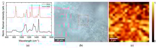 (a) Raman reference spectra of PAN and PEO; (b) microscopic image of PAN nanofiber mat with red square indicating the area of (c) a Raman false-color image.