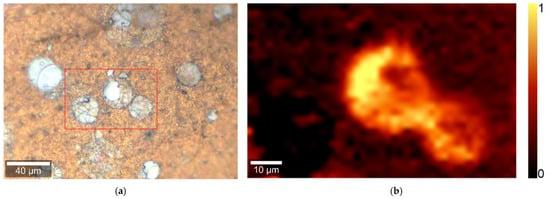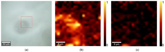 Following this, a PAN:PEO 9:1 sample was analyzed (Figure 5a). Again, a localized area of the sample was scanned, leading to the creation of two Raman false-color images through univariate analysis. The first false-color image corresponded to PAN, while the second was attributed to PEO. These images indicated that the predominant region comprised PAN, with only a minor area consisting of PEO. This will be discussed further in correlation with the FTIR measurements on this sample.