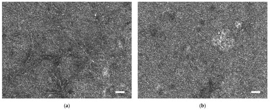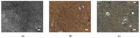 By comparing the stabilized (Figure 11) and carbonized samples (Figure 13), it is obvious that the formation of non-fibrous areas happens already during the stabilization process. One possibility to avoid this problem may be given by stabilization under an inert gas atmosphere, as described in [,,]; however, this would impede the stabilization of PAN, which necessitates oxygen. To explain the difference to the nanofibers reported in [,,] where no large non-fibrous areas were shown, the different electrospinning processes—needle-based in [,,] and wire-based in this study—have to be taken into account. Such deviations may manifest in different mixing of the polymer solution in the syringe/carriage, different electric fields in both techniques (typically 1 kV/cm for needle-based electrospinning; here, 2.5–3 kV/cm), potentially different spinning durations, temperatures or humidities. Further parameters such as the needle length in needle-based electrospinning also have an impact on the spinning process, but are not always given in the literature.