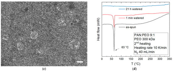 Figure 6 thus compares CLSM images of PAN:PEO 9:1 with PEO 300 kDa as-spun and after watering for 1 min or 21 h as well as corresponding DSC measurements. Generally, on this scale, some irregularities are visible in the nanofiber mats, which increase upon watering (Figure 6a–c). It should be mentioned that the DSC measurement (Figure 6d) reveals that PEO with a melting point near 65 °C [,,], depending on the molecular weight, is reduced after 1 min of watering and mostly vanishes after 21 h of watering. This indicates that the brighter, less fibrous areas especially visible in Figure 6c stem from washed-out PEO.