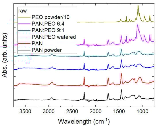 While the PAN:PEO 6:4 sample shows the expected superposition of PAN and PEO peaks, unexpectedly, the PEO peaks nearly completely vanished in PAN:PEO 9:1, even in the as-spun sample and not only in the watered one where PEO could be expected to be washed out. This finding may be attributed to the separation of both polymers during the spinning process and thus to larger areas mainly consisting of PAN and smaller areas mainly consisting of PEO. This finding corresponds to the results of Raman microscopy on the PAN:PEO 9:1 sample, as discussed before.