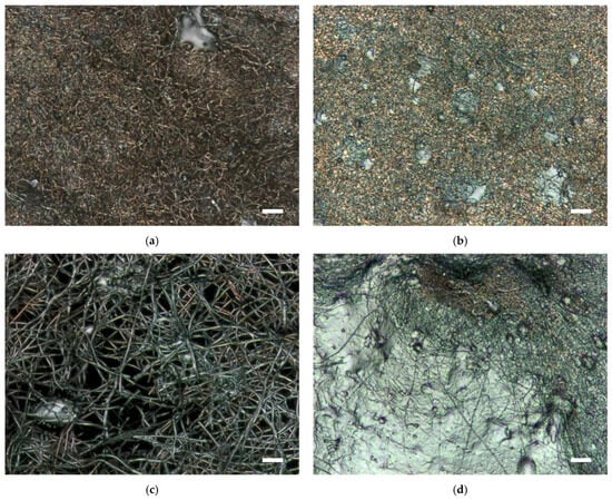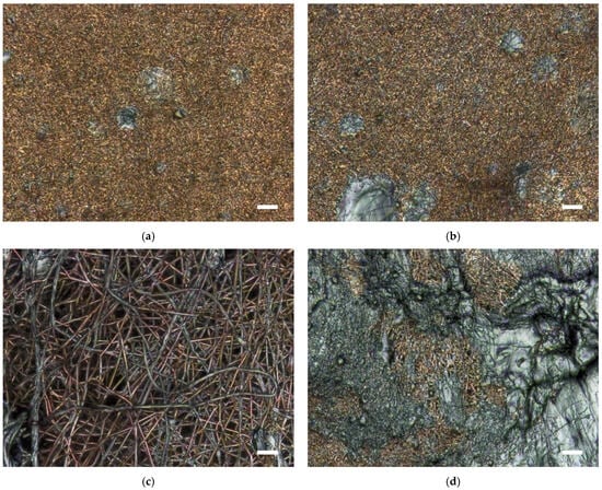 Interestingly, this is different for PAN:PEO blended samples, where stabilized samples become darker with an increasing amount of PEO (Figure 11). While samples with 90% PAN are nearly fully brown after stabilization (Figure 11a), dark-gray areas become visible for the samples with 20% PEO (Figure 11b), while the sample with the highest amount of PEO has largely dark-gray non-fibrous areas with brown fibrous regions embedded (Figure 11d). Interestingly, the sample with PAN:PEO 7:3 (Figure 11c) shows brown as well as dark-gray fibers, suggesting that thicker PEO fibers can withstand the stabilization process in spite of the PEO melting point (~63 °C) being much lower than the stabilization temperature. The clear difference between brown and dark-gray fibers further suggests that the difference between this sample and the others is not related to better mixing of the polymers, but has to be related to a difference in the spinning process.