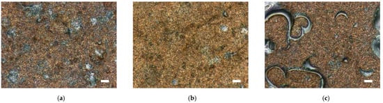 Comparing the stabilization processes of PAN:PEO samples with a ratio of 9:1 and different PEO molecular weights, Figure 12a shows a large amount of dark-gray PEO “isles” for PEO 40 kDa, while PEO 600 kDa (Figure 12b) leads to a relatively homogeneous result after stabilization, and PEO 1000 kDa (Figure 12c) shows clear inhomogeneities where PEO forms rounded lines. This supports the previous choice PEO 300 kDa as ideal for these tests.