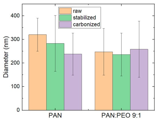 Based on the SEM images of the stabilized and carbonized nanofiber mats (Figures S6–S9), Figure 15 depicts exemplarily the nanofiber diameter distributions for a pure PAN nanofiber mat and PAN:PEO 9:1 (300 kDa). While the nanofiber diameter of the PAN nanofiber mat decreases with each thermal treatment, the average diameter remains approximately constant for the PAN:PEO 9:1 (300 kDa) sample during stabilization and carbonization.