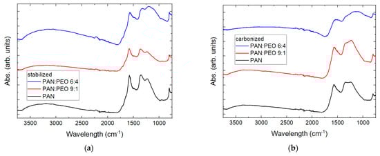 The carbonized samples (Figure 17b) show relatively large signals, indicating that carbonization is not finished, as pure carbon is chemically almost inert and thus does not show any peaks [,]. Here, again, a clear difference between PAN:PEO 6:4 and both other samples is visible, as was also the case for stabilized and raw samples.