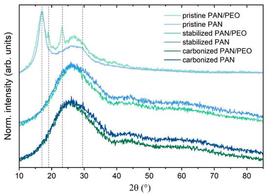 The XRD patterns of the untreated PAN and PAN/PEO nanofibers show clearly identifiable diffraction peaks, which can be assigned to the respective polymers in good agreement with the published literature (17° for PAN and 19.1° and 23.3° PEO) [,]. Stabilization leads to amorphization, which is indicated by the disappearance of sharp diffraction peaks. Progressive carbonization and cyclization of the molecular structure lead to a gradual increase in long-range order, which gradually narrows the diffraction peaks towards a semi-crystalline hard carbon structure. The characteristic diffraction peaks, which only fully appear at higher temperatures, are [002] at about 22.2° (26.5° for graphite) and [100] at about 43.5° [58].
