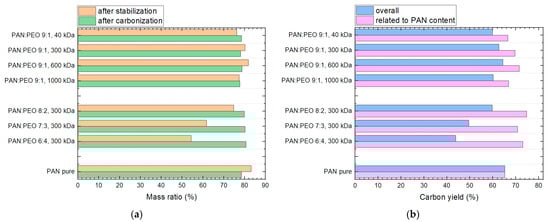 (a) Mass ratio of samples under investigation after stabilization and carbonization only; (b) carbon yield calculated for the overall sample mass and normalized to the PAN content.