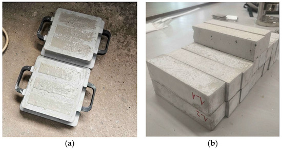 Cement-based mortar preparation: specimens in (a) fresh and (b) hardened state.