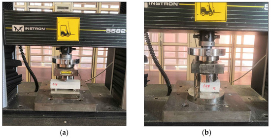After this period, compression and flexural tests were carried out, in accordance with EN 1015-11:2019 [25], to determine the compressive and flexural tensile strengths of the mortars. To this end, 108 (18 × 6 types of mortar) specimens were subjected to a three-point flexural test using the set-up illustrated in Figure 3a.