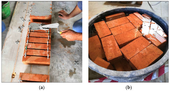 Masonry wall preparation: (a) application of the mortars and (b) bricks soaked in water.