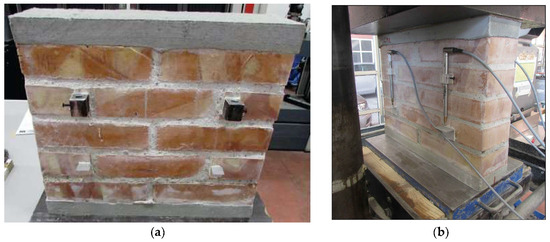 Following the recommendation given in EN 1052-1:1998 [26], the panels were built with dimensions of 510 × 125 × 315 mm3 (height × thickness × width). Compression tests were carried out, in accordance with EN 772-1:2011 [27], to determine the mechanical behavior of the bricks employed for the construction of the walls. From the results obtained, average values of the compressive strength (fb = 68.20 MPa) and characteristic compressive strength (fbk = 40.96 MPa) were found. As shown in Figure 4b, the bricks were soaked in water for 2 h to prevent the absorption of the mixing water.