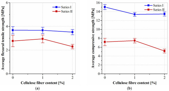 Mechanical property variations of the mortar with cellulose fiber content: (a) average flexural tensile strength and (b) compressive strength.