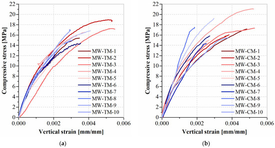The compressive stress vs. vertical strain curves of the small-scale masonry walls are reported in Figure 8. Each specimen is labeled according to the following nomenclature: (i) type of element (MW—masonry wall); (ii) type of mortar (TM—traditional mortar; CM—mortar with 1% of cellulose fiber), and (iii) specimen number. Note that the compressive stress was computed as the ratio between the load and the loaded area of the specimens.