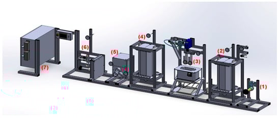 In industry, CF sizing is a continuous process; thus, a pilot-scale continuous sizing line had to be designed for this study. The core compartments of the line were identified, and an initial sketch was drawn. IZUMI International, a company with experience in fibre line manufacturing, was selected for the line construction. The compartments were digitalized with use of SolidWorks, a CAD desktop system that provides product-level automated design tools []. A model was proposed that included all the core compartments and extra parts that compose the fibre sizing line (Figure 1). The latter are analysed below.