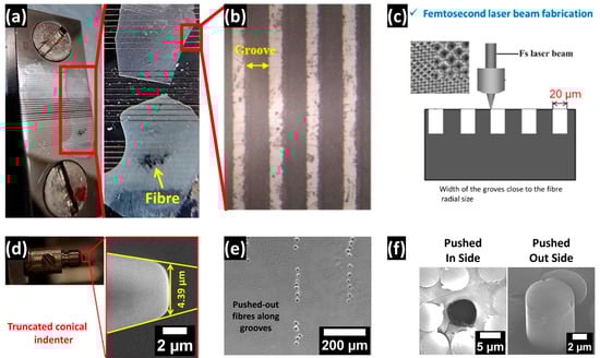 Push-out test sample holder with attached composite slices (a), optical microscope image of the fabricated grooves on the sample holder (b), overview of the femtosecond laser fabrication of the grooves (c), overview of the shape of the push-out test conical indenter (d), electron microscope image of pushed-out fibres on thinned composite slices along the fabricated grooves (e), and magnified view of the pushed-in and pushed-out sides of a typical carbon fibre following single-fibre push-out testing (f). Magnified images of specific regions are indicated by red frames and lines.