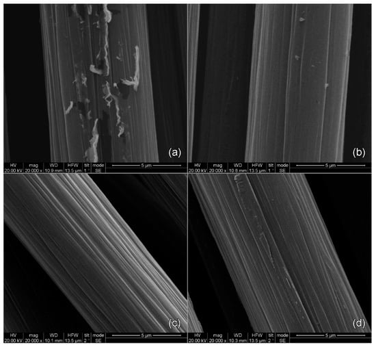 Evidently, temperatures of 350 and 400 °C have an effect on the CF’s surface, as can be observed from Figure 4a,b. The pre-existing polymeric sizing starts to degrade and debond from the fibre surface. This indicates that the residence time is not long enough or there is not enough energy derived from heat (due to low temperature) to entirely remove the coating. The desizing phenomenon intensifies at temperatures of 450 and 500 °C, where it is obvious from Figure 4c,d that a large amount of the thin polymeric film is detached from the surface, leaving the exposed CF area available for new sizing. However, it is only at temperatures of 550 and 600 °C that the CF surface area is totally exposed, as the preexisting sizing is completely removed.
