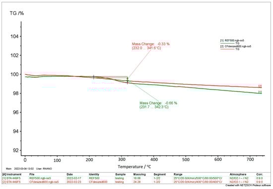 The commercial sizing that was removed during the desizing stage was evaluated also by thermogravimetric analysis using a TGA apparatus (STA 449 F5 Jupiter, Hamburg, Germany). Instrument calibration for temperature and sensitivity was performed prior to testing. Two sets of tests were performed with 16 and 24 mg of carbon fibres at a heating rate of 20 °C/min in N2 atmosphere (50 mL/min) from room temperature to 750 °C, and mass change was measured as a function of temperature. The analysis was performed in accordance with ISO 11358 [].