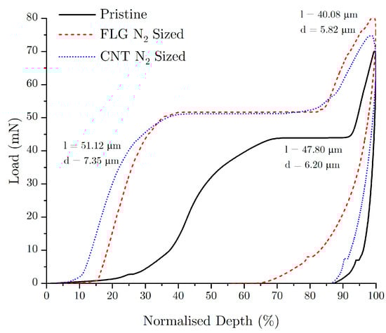 Normalised depth against indentation load during single-fibre push-out testing of pristine, FLG-N2-sized, and CNT-N2-sized fibres embedded in resin. The length of the fibre (l) and the average diameter of the fibre (d) are also provided for each sample.