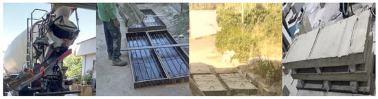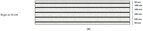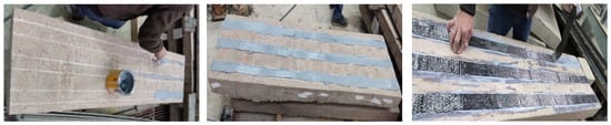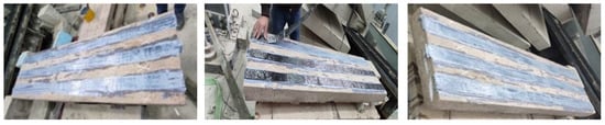 Initially, grooves were marked on the concrete surface with a width of 10 mm and a depth of 20 mm along the tensile surface of slab and then they were cut using an electric saw. After that, the grooves were cleaned by a vacuum cleaner of dust and dirt in preparation for filling the grooves with Sikandar®-330 epoxy to install ropes and strip in the grooves, anchoring them with epoxy and leveling the surface. The installation process for both ropes and strips are similar as shown in Figure 10, with the difference being that the ropes were immersed in Sikandar®-52 LP epoxy. Repair samples were left at laboratory temperature for 7 days to ensure full strength development, as recommended by the manufacturer.