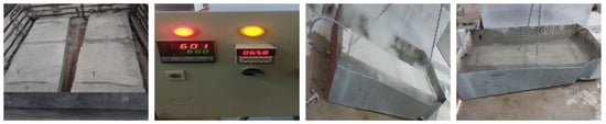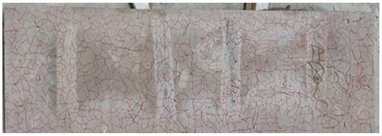 An oven with external dimensions of 1.7 m × 2.2 m × 0.7 m and internal dimensions of 2 m × 1.5 m × 0.6 m was utilized in the experiment. Seven out of the nine slabs and three cubes were exposed to a high temperature of 600 °C and maintained for three hours. After that, the slabs were rapidly cooled by immersion in a water tank for 15 min following the International Organization for Standardization (ISO) []. The temperature monitoring was performed by a digital temperature reader, as shown in Figure 5. The actual heating curve observed over the four days during which the samples were heated is presented in Figure 6. Accurate cracks were frequently observed due to the large change in temperature in a short time, as shown in Figure 7.