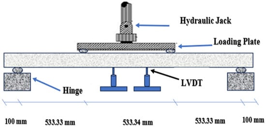 All RC slabs were tested under four loading points, with the slabs simply supported at 10 cm from the specimen ends. The second and third loading points were positioned at one-third of the free distance. The test was conducted using a hydraulic jack with a maximum capacity of 700 kN, where the load rate was applied at a constant rate of 5 kN/min. Additionally, two linear variable deflection transducers (LVDTs) were mounted in the middle band under the tensile surface of the slab to record deflection. Figure 12 shows the test setup.