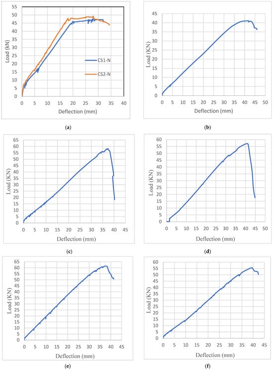 Load-deflection curve of slabs: (a) CS1-N; CS2-N; (b) CS3-ETS; (c) RS-R-D10; (d) RS-R-D20; (e) RS-St-D10; (f) RS-St-D20; (g) RS-Sh-L1; (h) RS-Sh-L2.