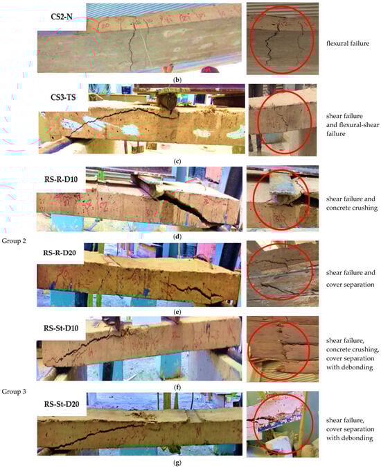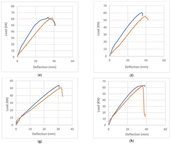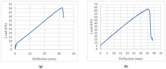 Many failure modes were observed in tested RC slabs samples such as flexure cracks, shear crack, debonding, concrete crushing, and cover separation, as shown in Figure 15. The failure mode of unheated control slabs was flexural failure. This flexural failure happened toward the midspan of the RC slab. As the external applied load increased, the additional cracks developed, as shown in Figure 15a,b. The failure mode of heated and repaired slab using the NSM-CFRP technique was shear failure as shown in Figure 15c–h; this can be explained when using CFRP, because the flexural capacity became greater than the shear capacity of the slab, and this led to brittle failure. Finally, the samples repaired using the CFRP-NSM technique exhibited shear cracks accompanied by the separation of the concrete cover, ultimately leading to debonding failure as shown in Figure 15d–h. This can be attributed to the increased stress concentration caused by CFRP confinement on the tensile surface. In addition, this phenomenon can be explained by the fact that the distance of the concrete cover, including the groove, was 20 mm; this distance led to increased tensile strength in that specific area resulting in elevated stress in the groove areas thereby increasing the probability of separation.