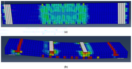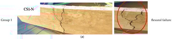 In a similar context, Ref. [] investigated fourteen slabs measuring 4.5 × 0.96 × 0.2 mm, exploring diverse configurations of materials for FRP strengthening. Their findings revealed that failure mechanisms, particularly debonding with pultruded strips, exhibited a higher propensity. Additionally, wet layup strips demonstrated a combination of full-width fiber rupture and debonding.