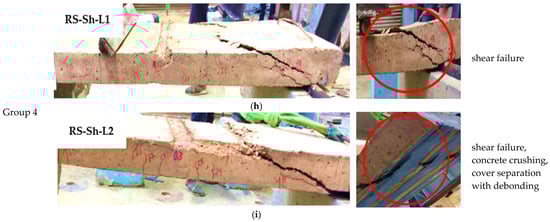 Failure mode of slabs: (a) CS1-N; (b) CS2-N; (c) CS 3-ETS; (d) RS-R-D10; (e) RS-R-D20; (f) RS-St-D10; (g) RS-St-D20; (h) RS-Sh-L1; (i) RS-Sh-L2.
