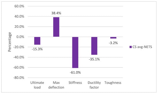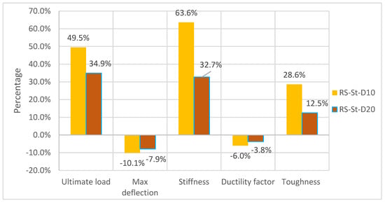 Referring to Figure 14 and Table 6, the ultimate load decreased due to thermal shock by 15.3% when compared to CSavg-N. However, slabs repaired using CFRP materials showed an increase in ultimate load ranging from 23.9% to 53.4% compared to CS3-TS. The maximum improvement in ultimate load was 53.4%, achieved using two sheets, while the minimum improvement was 23.9%, observed with using one sheet. Furthermore, the ultimate load of all slabs was restored after being exposed to thermal shock.